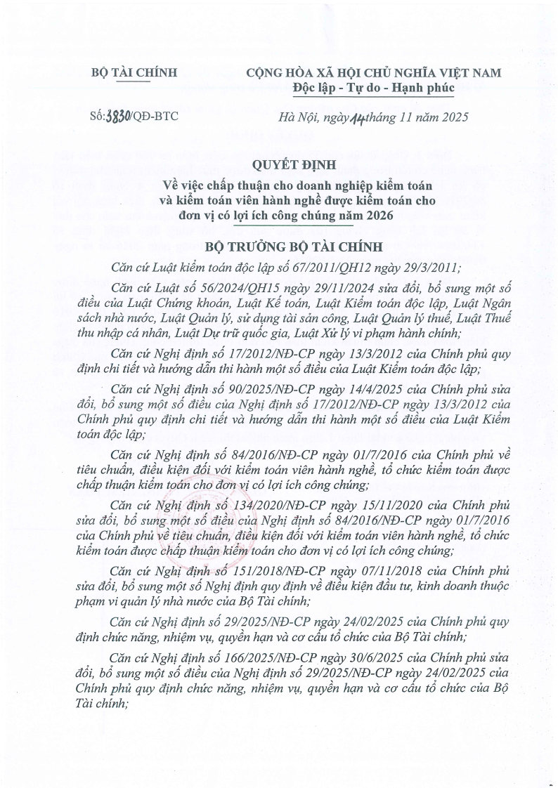 Ngày 14 tháng 11 năm 2025 Bộ Tài chính đã ra Quyết định số 3830/QĐ-BTC về việc Chấp thuận cho doanh nghiệp Kiểm toán (Công ty TNHH Kiểm toán NVA - số thứ tự 28) và kiểm toán viên hành nghề được kiểm toán cho đơn vị có lợi ích công chúng năm 2026.