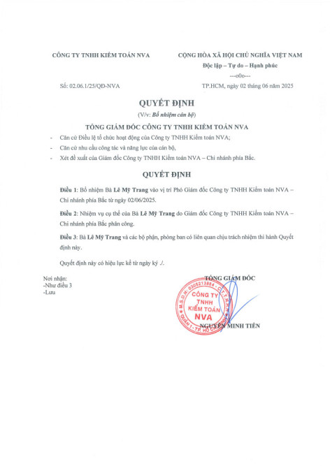 - Quyết định 02.06.1/25/QĐ-NVA bổ nhiệm Phó giám đốc Công ty TNHH Kiểm toán NVA - Chi nhánh phía Bắc